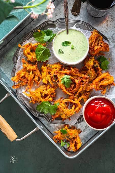 Sliced onion dipped in chickpea batter and deep fried