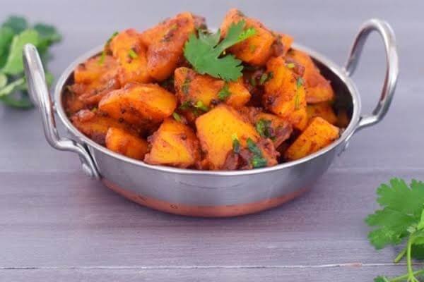 Potatoes deep fried and cooked in Indian spices. This is a dry dish