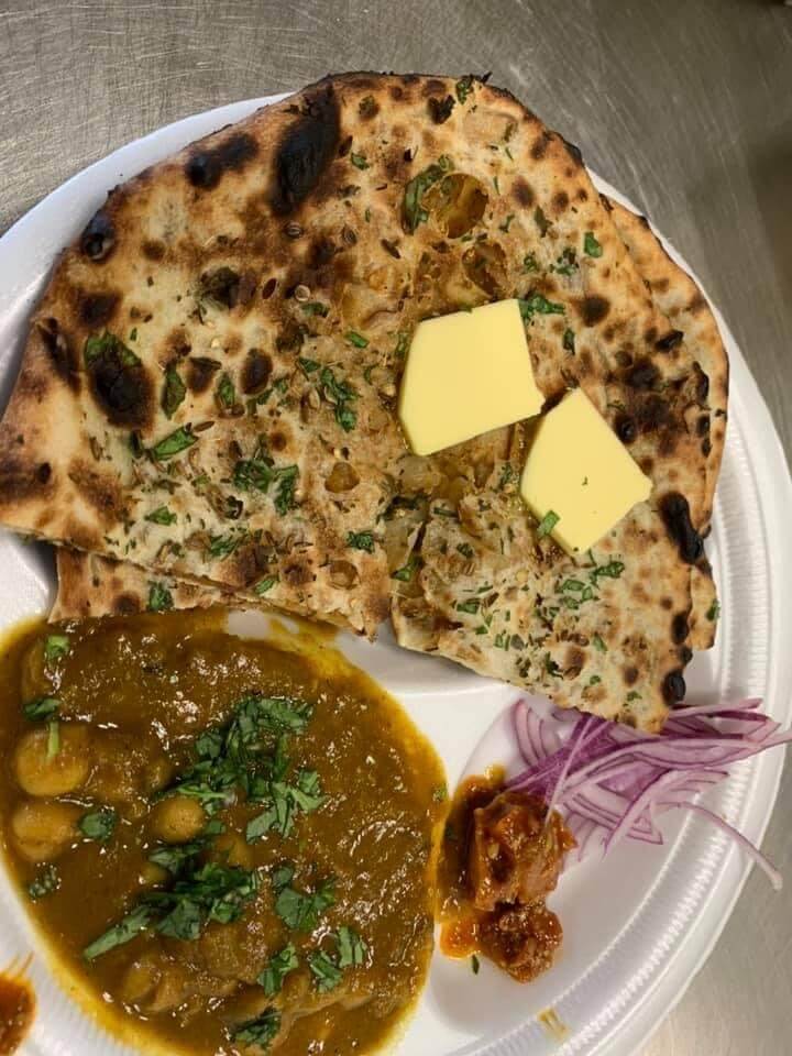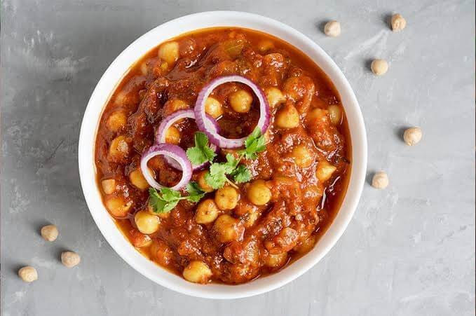 Chickpeas cooked in Tomato gravy, ground spices and garnished with shredded ginger